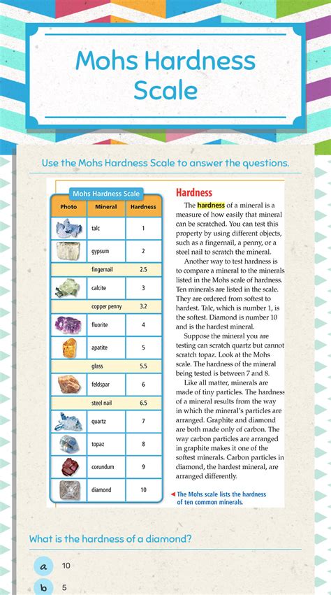 Worksheets are mohs hardness scale, mohs mineral hardness scale 20 directions, hardness of minerals i the mohs sc. Complete the mohs mineral hardness scale below by drawing and coloring pictures of each of the 10 minerals (1 color in each pic is. This lesson includes two thinking routines and a comprehension passage on the mohs.