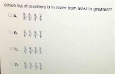 Web rewrite the numbers in order from least to greatest. 2/4 = 0.5 5/2 = 2.5 3/7 = 0.42 9/4 = 2.25 6/5 = 1.2 step 2: Because none of the numbers in the ones place are the same, it doesn't matter.